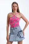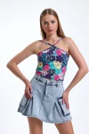 Önü Çapraz İnce Askılı Desenli Normal Kalıp Likralı Crop Bluz IHR-U-2